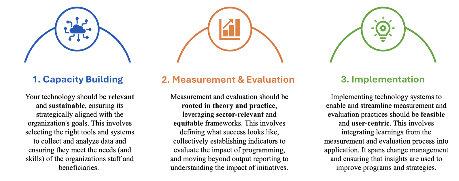 A nonprofit organization sought to evaluate whether their program is helpful for the community. This involves defining what "helpful" means (M&E), selecting the right data system to collect and store data (Technology), and implementing the right tool to analyze data (Implementation). By strategically aligning their infrastructure with their goals, they can more effectively measure and improve their program's impact.
